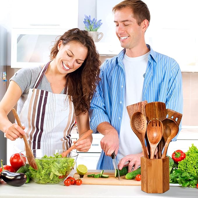 • 【100% Natural High-Quality Material】 Wooden kitchen utensil set is made of 100% handmade with natural teak.The material is strong and durable,it will not crack or deform and you can use it for a long time. It also has beautiful and unique wood grain.Give your kitchen a high-end atmosphere.