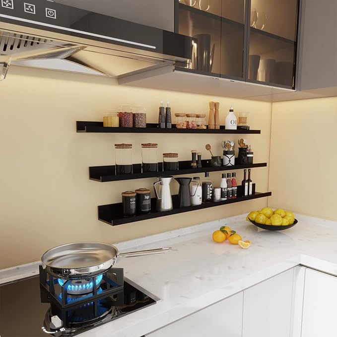 - U-shape Design: The classic lifted lip ledge prevent items from falling off or sliding forward. Set of 3 different shelf sizes, Large: 47x4.8x2.6 inches, Middle: 47x3.9x2.3 inches; Small: 47x3x1.9 inches.