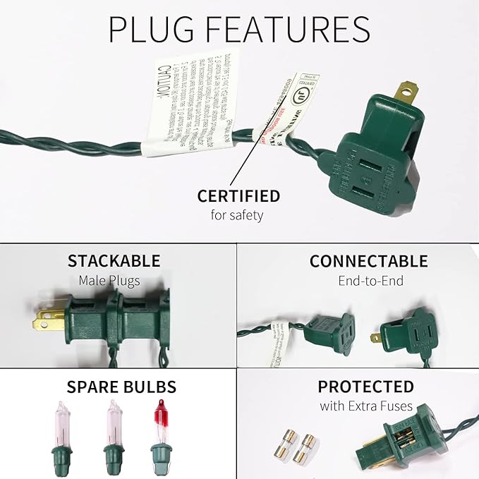 - Product Nature:Each mini Christmas light set comes with end-to-end plug, can be connectable up to 5 sets (500 lights). Each bulb space 2.5in, 2.5V and 0.425W per bulbs, built-in 3A fuse for safe use. Extra bulbs and fuses are included.