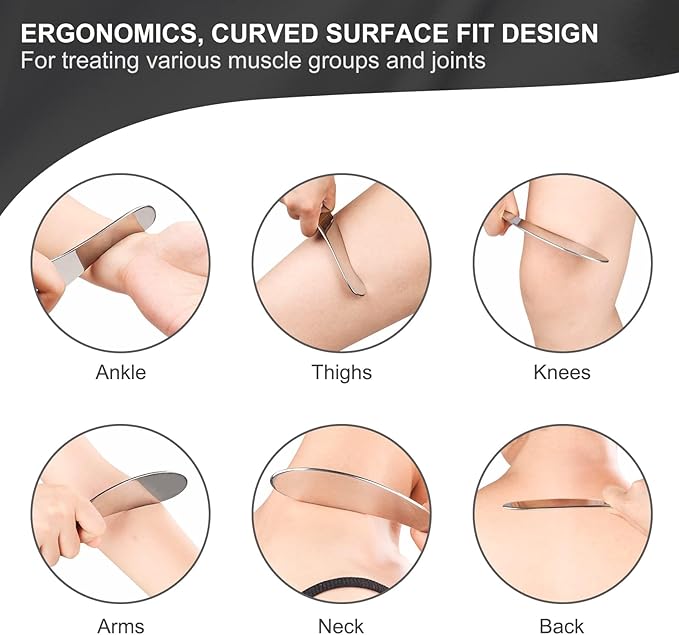 • RELIEVE SORENESS: This stainless steel gua sha tool effectively relieves muscle soreness, knots, and tightness through gentle scraping and massaging of soft tissues.