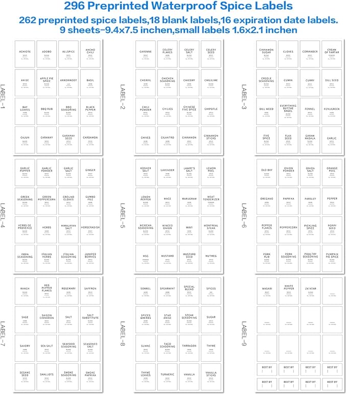 • 【BLACK AND WHITE WATERPROOF SPICE JAR LABELS】Our bamboo lid spice jars labels of black and white color. Include 262 preprinted spice labels, 18 blank labels, 16 expiration date labels.