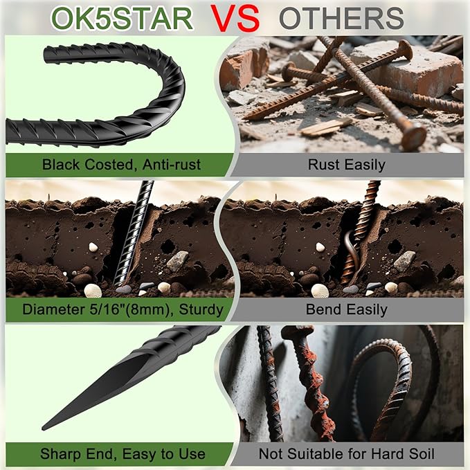 • Strong and Sturdy: Curved rebar stakes are made of heavy duty steel. 5/16"(8mm) Diameter, j hook stakes is solid all the way, not hollow inside