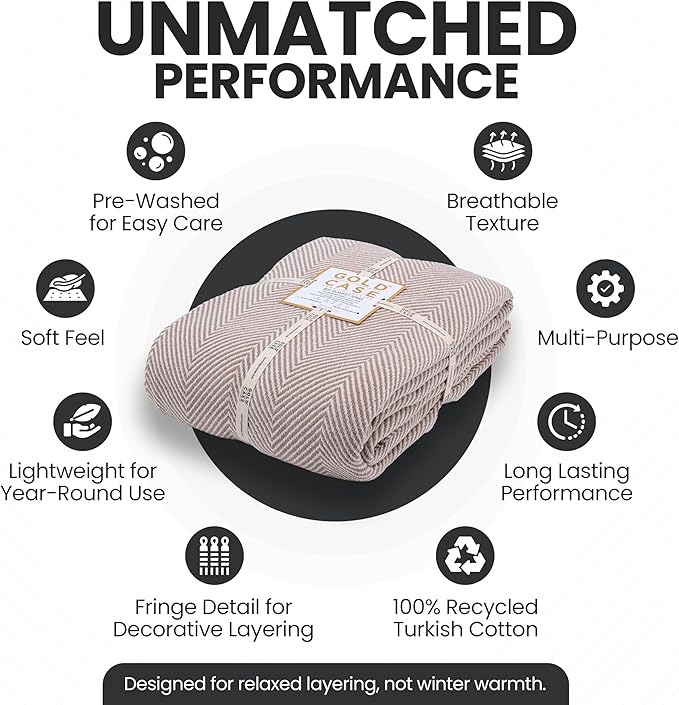 Gold Case Throw Blanket for Bed – 100% Recycled Turkish Cotton Bed Blanket – Decorative Throw Cotton Blankets for Living Room & Bedroom – Elegant Beige Woven Queen Blankets – 90x90