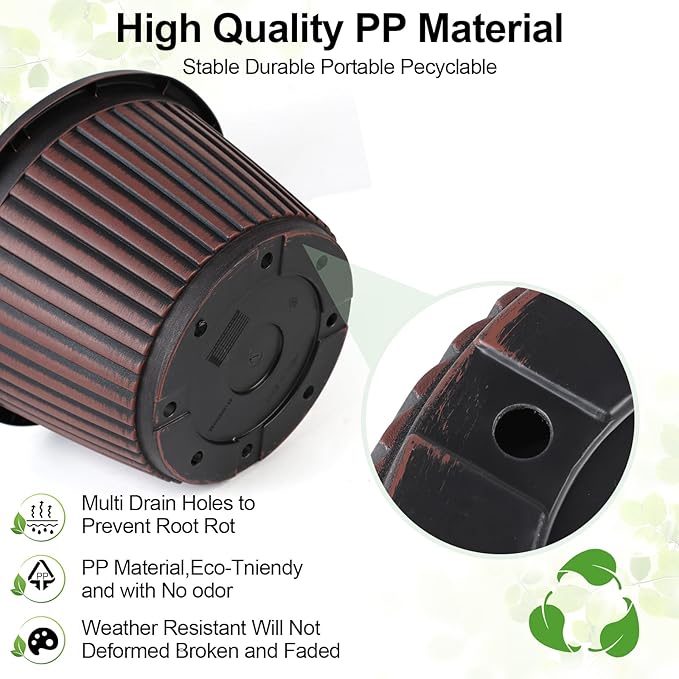 - 【Perfect Size & Sturdy Material】Top diameter: 10 inch, bottom diameter:6.57 inch, height: 6.4 inch, capacity: 1.34 gallon. Plastic plant pots are made of recyclable polypropylene resin which is lightweight but sturdy, not easy crack. These indoor outdoor planters are UV and weather resistant. 10 inch flower pot is perfect for planting medium to large sized plants.