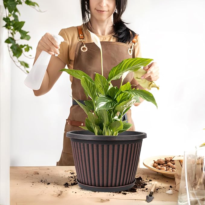 - 【Modern Style Planters】10 inch indoor planters with saucers provide a unique,nice style in ribbed design which gives an understated elegance that will enhance the beauty of your plant. These 10 inch plant pots are available in red-brown &blue-green & gold finished with a black antique stain. Plastic flower pots would be a beautiful addition to anyone’s deck or sunroom or house! for indoor and outdoor . With better breathabiity and water absorption, it’s beneficial to the healthy growth of plants.