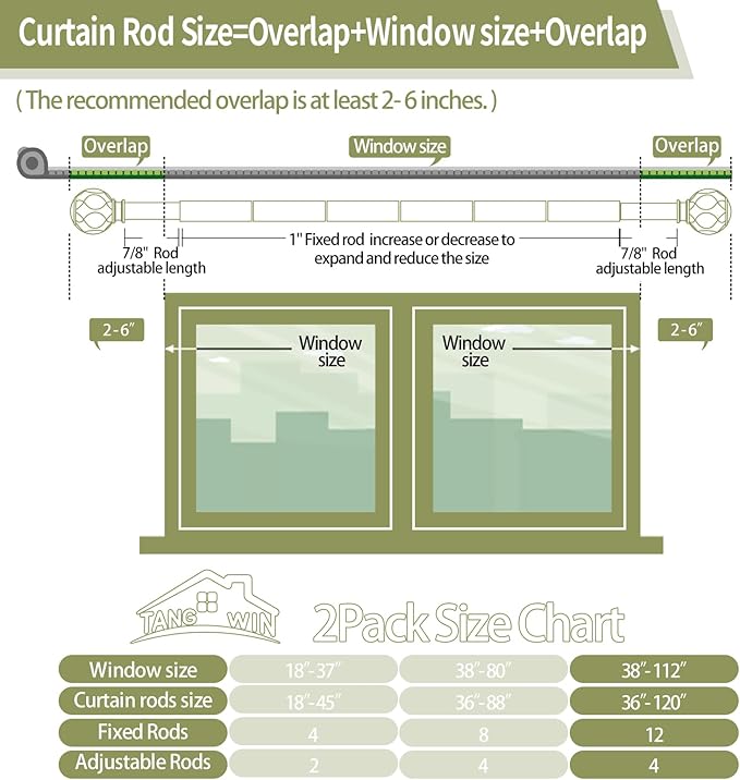 - 2 Pack Curtain Rods for Windows 66 to 120 Inch (5.5-10ft)οΌTANGWIN Wood drapery rods include 12 x 16" x 1" fixed rods, 4 x 16" x 7/8" adjustable rods, 4 x finial, 6 x bracket, 10 x connector, 12 x anchor, 12 x screw. 2 Pack wood curtain rods for windows can extend from 36 to 120 inches, choose the right size curtain rods according to the length of your window.