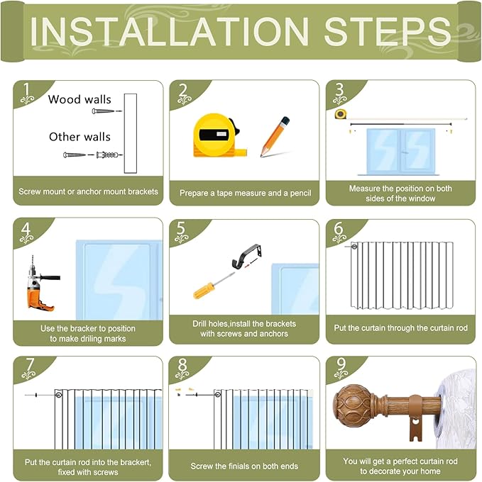 - 2 Pack Easy to Install Curtain Rods: TANGWIN provide detailed illustrated size instructions and modern decorative window curtains rod shipping package has detailed installation instructions inside, follow the steps, 2 pack brown wood curtain rods can easily complete the installation.
