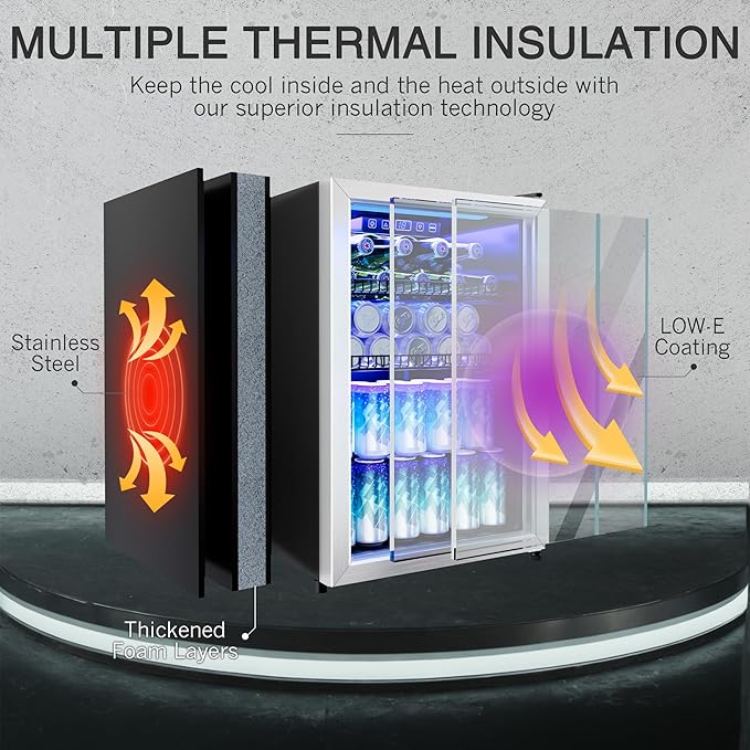 - [Refrigeration & Cooling Storage 2-in-1] I wanted to let you know that this wine cooler is pretty cool! It uses advanced air cooling technology that allows for 360Β° full-angle recirculated air duct cooling, which means that everything inside gets cooled evenly. Pretty neat, huh? You'll also appreciate the beautiful glass door with a low-e coating and a high density door seal that prevents cold air from escaping while blocking warm air from entering.