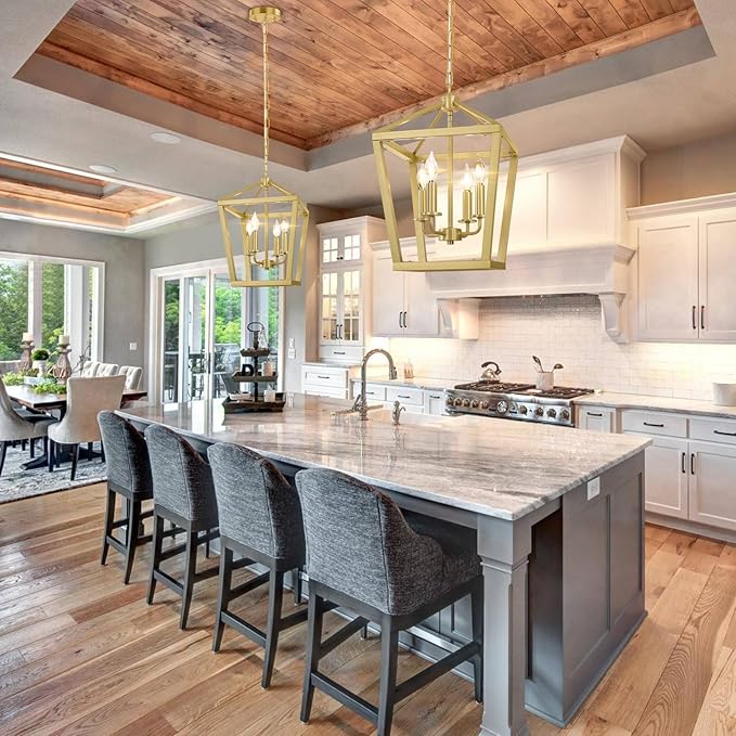 - 【Statement-making Light】The gold chandelier with 4-light interior candelabra provides abundant light to your home while lending a rustic flair in an iconic lantern silhouette. With its dense modern farmhouse style, it is both a lighting fixture and a great decoration in any space like dining room, kitchen island, living room, bedroom, hallway and foyer. Great choice for your home decor