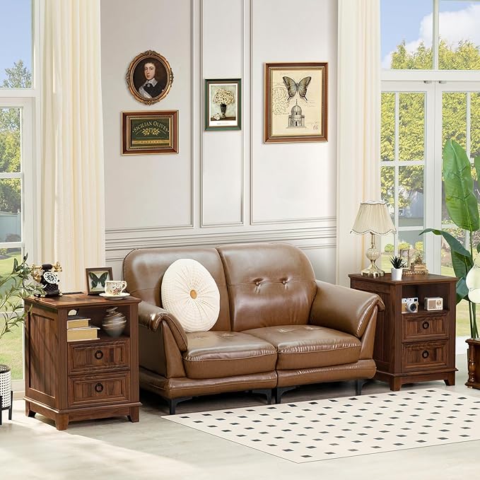 - [End Table with charging station] The side table with storage is equipped with 2 standard AC sockets and 2 USB ports. This tall nightstand provides great convenience when you use electronic devices, keeping your charging devices within reach. A 2.3-inch round hole is designed on the back to facilitate the arrangement of socket power cables and charging cables, making the desktop more tidy.