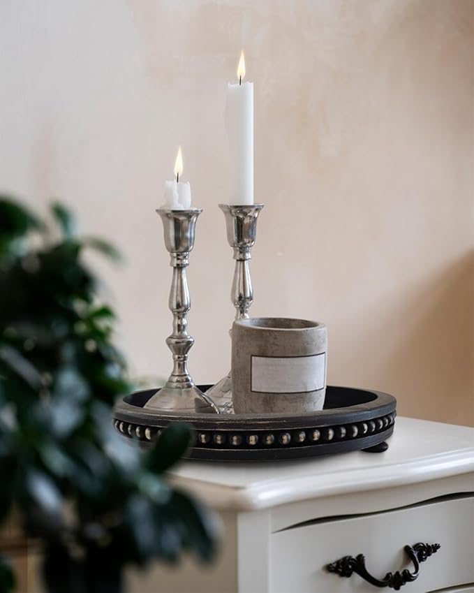 • Stylish Design: The classic round shape, beaded design and natural wood finish of this wood tray complement any decor style. Whether you're looking to add a touch of sophistication to your living space or simply want a functional yet stylish piece, this decor tray fits the bill.