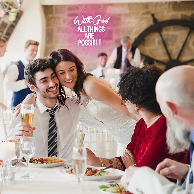 - Divine Neon Sign: God neon signs are the phrase “With God All Things Are Possible”. Pink neon lights illuminate the space and add a fun touch.