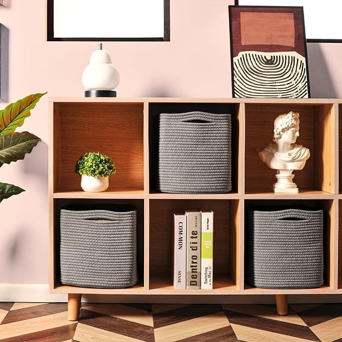 - Natural Cotton Rope Baskets for Storage: Our 11x11 cube storage bins are all made of natural cotton. These grey storage baskets for shelves are soft, durable, foldable and safe for children and pets. Using our woven baskets for storage to organise and store your home will give you peace of mind