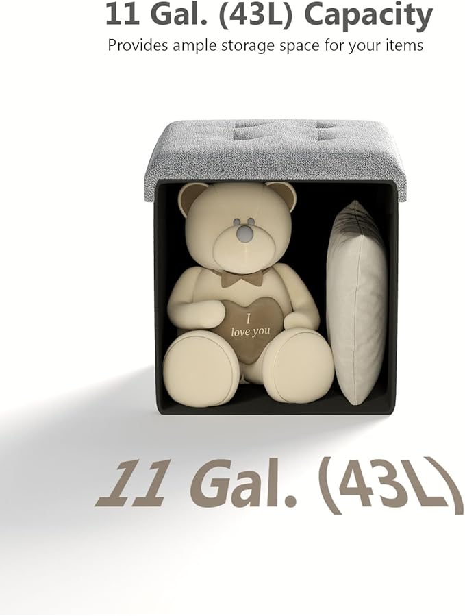 - [Plenty of Storage Space] This folding ottoman, sized 15”D x 15”W x 15”H (38 x 38 x 38 cm) with a total capacity of 11 gallons, can be used to neatly organize your bed sheets, pillows, blankets, magazines, and more