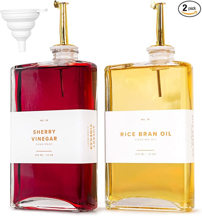 • ELEGANT GLASS OIL DISPENSER FOR KITCHEN: This premium oil and vinegar dispenser set includes two 12oz glass oil bottles for kitchen, designed to keep your favorite oils and vinegars fresh while adding a sleek touch to your kitchen.