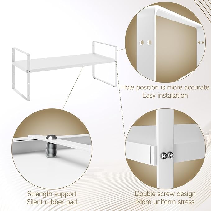 - Easy Installation and Stronger Build: The Cabinet Shelf Organizers are made of sturdy steel and coated with an eco-friendly finish that is rust-resistant, easy to clean, and prevents corrosion. The design includes additional support points on the sides for better stability and a weight capacity of up to 80 pounds.