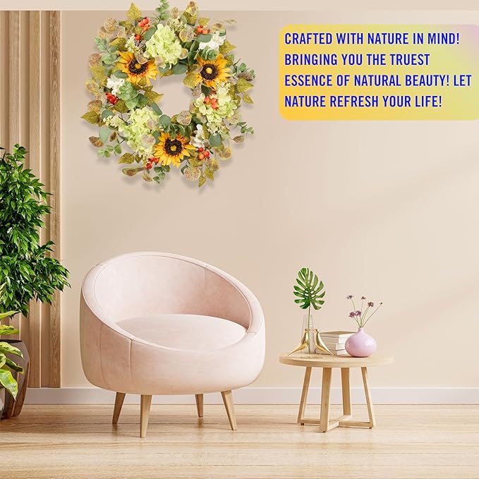 - Premium Craftsmanship – Made of high-quality silk flowers and natural grapevine, this sunflower wreath, hydrangea wreath, and eucalyptus wreath is handcrafted for lasting beauty. Ideal for indoor and outdoor use as a spring farmhouse wreath, front door wreath, or seasonal wall decor
