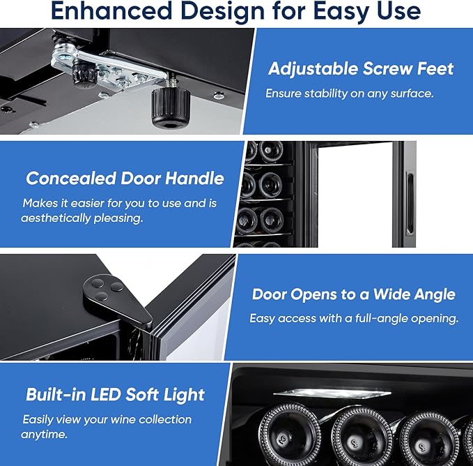 - Sleek Stainless Steel & Glass Design: With a stainless steel exterior and a tempered glass door, this wine fridge combines style and functionality. The sleek, modern design fits seamlessly into any kitchen, bar, or office. The glass door provides a clear view of your wine collection while also helping to maintain temperature stability. This elegant design ensures that your wine is stored in both a beautiful and practical space.