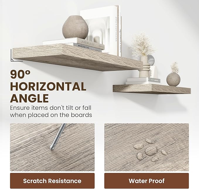 - 【Premium Quality Construction】Crafted from high-grade engineered wood with an invisible one-piece bracket, these floating shelves offer a robust and sleek design. The rustic wooden grain finish not only adds a touch of elegance but also infuses warmth into any room, making them a perfect fit for both modern and traditional interiors.