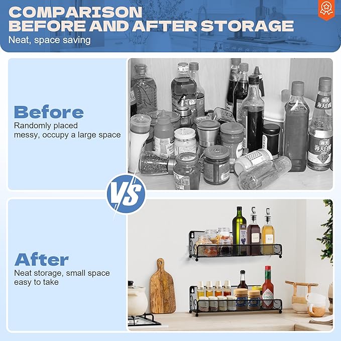 - Premium Metal Material and Stable Storage: The spice rack wall mounted is made of thickened high-strength carbon steelοΌis waterproof, rustproof, easy to clean.Our spice rack comes with additional 2.36-inch side guards and reinforced adhesive stickers to ensure safety and stability.