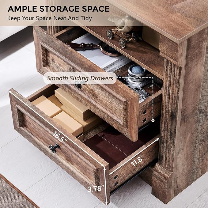 - CONVENIENT CHARGING STATION: Farmhouse nightstand featuring a built-in charging station. Equipped with 2 USB ports and 2 AC power outlets, it ensures your devices are always charged and ready to go. The back panel includes a 2.3-inch diameter cable management hole, keeping your space neat and organized. With a spacious tabletop, you have plenty of room for your essentials and favorite decor