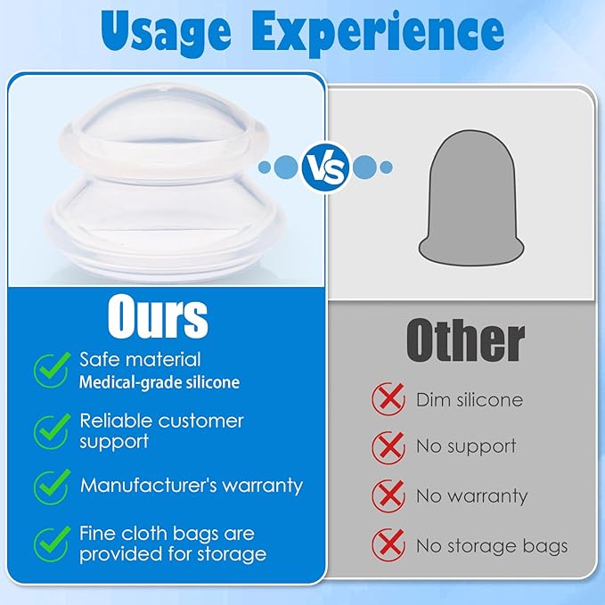 • Include 15pcs Massage Silicone Cups: 2pcs-Extra Large Cups (3.9”x 3”),4pcs-Large Cups (3”x2.2”), 4pcs-Medium Cups (2.4”x1.8”), 5pcs-Small Cups (1.8”x1.4”), A delicate flannel bag, Easy to store those cups.