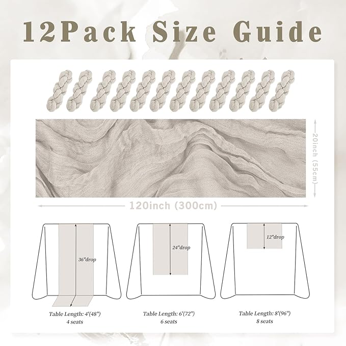 - Cheesecloth Table Runner Size: You will receive 12 rose brown cheesecloth tablerunner, each measuring 20 x 120 inches. The quantity is sufficient for you to decorate various romantic occasions. It can decorate most shaped tables, such as rectangular tables, round tables, and cocktail tables. It is long enough to decorate a large table and be placed perfectly and elegantly on the tabletop, adding a romantic atmosphere to your occasion.