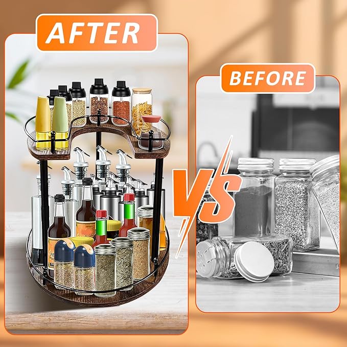 • Solid Wood & Iron Construction: This rotating spice rack is made of vintage solid wood and metal and is very sturdy and durable. Unlike ordinary wood, it has a special coating that makes it waterproof and heat-resistant, so it can be finish prevents stains from oils/vinegars