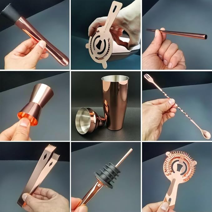 • Bartender Kit included: 1*750ml(25oz) shaker, 1*muddler, 1*15/30ml(0.5/1oz)jigger, 1* ice tongs, 1* ice strainer, 1* fork&spoon, 4 *drinking straw, 4 * Pourer, 1* cocktail Recipes, 1*black stand.