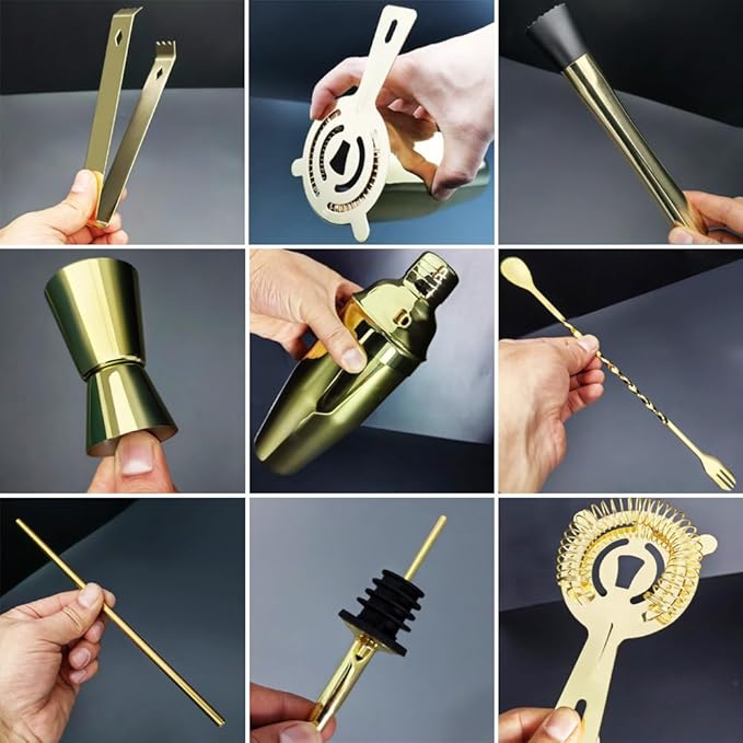 • Bartender Kit included: 1*750ml(25oz) shaker, 1*muddler, 1*15/30ml(0.5/1oz)jigger, 1* ice tongs, 1* ice strainer, 1* fork&spoon, 4 *drinking straw, 4 * Pourer, 1* cocktail Recipes, 1*black stand.