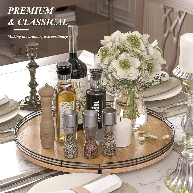 - UPDATED DESIGN: With larger wood base on this lazy Susan for table top, the turntable organizer doesn't wobble, even with heavier items on it. With premium oak wood and classical iron fence make this lazy Susan turntable stylish, functional and adding a touch of rustic charm. itβs also very easy to clean. There are included anti-slip pads on the bottom of the lazy Susan for extra surface protection.