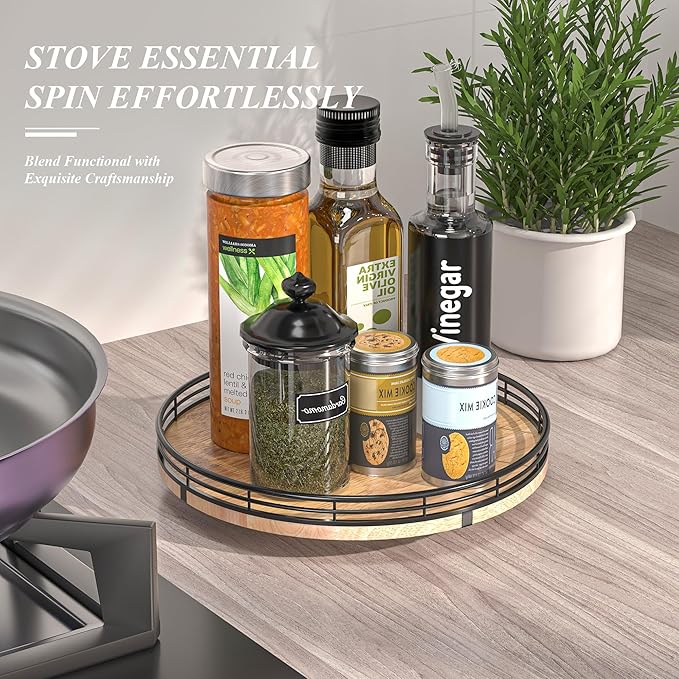- 360 RATATING & MAXIMIZE SPACE: The base is made of solid wood and the spinning mechanism is made of steel ball bearings, which are well-built and allow for 360Β° smoothly spin. Making it super easy to access items at the back of your cabinet without having to remove everything in front. You can use it to store spices, condiments, and even small jars, and it keeps everything neatly in place.