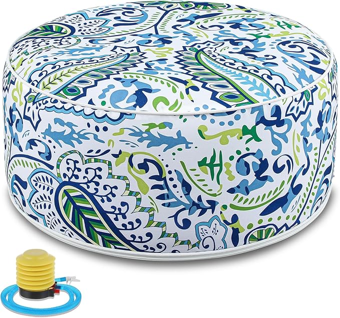 - Safe and Easy to Assemble: carefully designed with your convenience in mind, the round foot stool comes with a convenient inflation solution; Simply ensure the inflation port faces upward and do not fill it too full at once; Inflate partially, fit the inner core into the fabric cover, add more air and ensure to press the air nozzle down to flatten it in the end