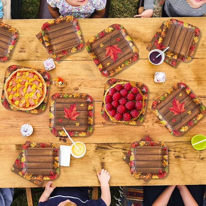 - 【200Pcs Fall Party Decorations】Our fall maple leaf paper plates and napkins sets includes 50 * 9'' square fall maple leaf plates, 50 * 7'' square fall maple leaf plates, 100 * 6.5'' fall maple leaf paper napkins, great for cakes, snacks, and other types of dinner. The autumn maple leaf party cutlery combination really adds dimension to your party, as your guests will love beautiful and exquisite designs that add color to your party
