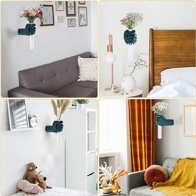 Green Wall Sculptures, Hand Vases Home Decor, Wall Mount Art Sculpture, Unique Wall Art Statue, Funky Flower Vase Decorations, Modern Eclectic Hanging Decor,Glass Test Tube Vase