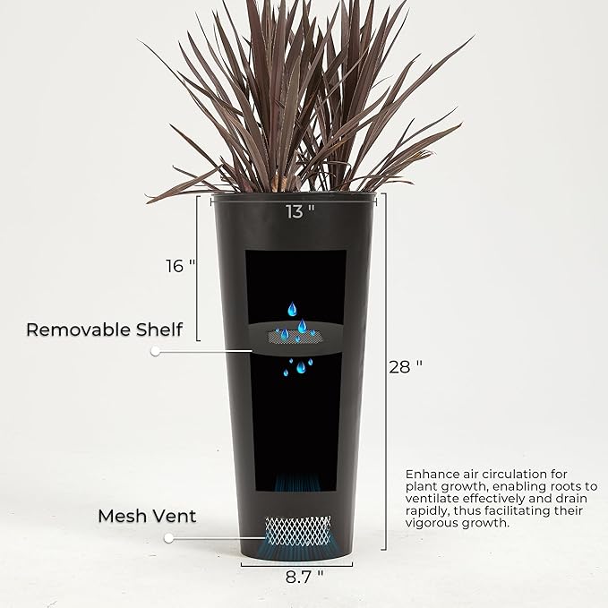 - Heavy-Duty Steel Planters for Outdoor Plants: 2-pack 28"H steel planters with 13" top diameter—built for decade-long outdoor use. High-quality steel resists rust, UV damage, and cracking in cold climates.