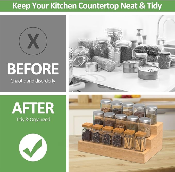 - DISORDER DESTROYER - With our tiered spice racks, it's difficult to forget about spices in the back of your cabinet. You won't play a guessing game as you lift them one at a time to check. This is a simple solution to make all of your spice jars visible. It keeps them within reach when you are cooking.