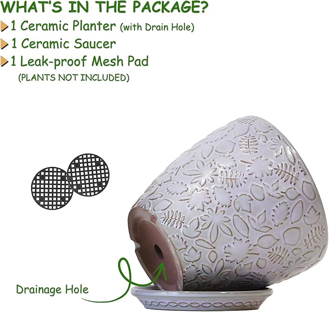 - Size & Package: 10 Inch Pot . Package: contains 1 ceramic flower pots, 1pcs mesh pads and 1pcs saucers(NOT INCLUDE PLANTS)