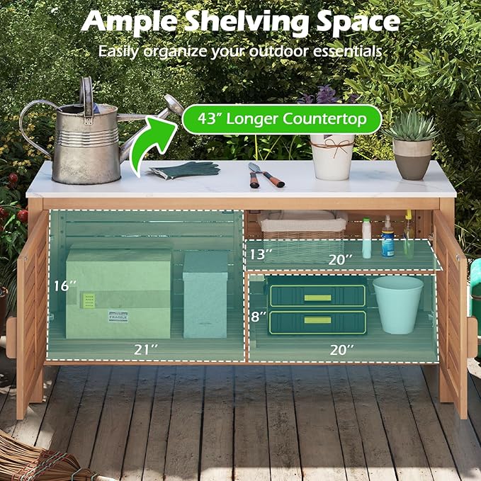 - Generous Storage Capacity – Featuring an extended 43" (109 cm) countertop and spacious internal shelving, this patio storage cabinet offers ample room to neatly store tools, cushions, and outdoor essentials — keeping everything well-organized and within reach.